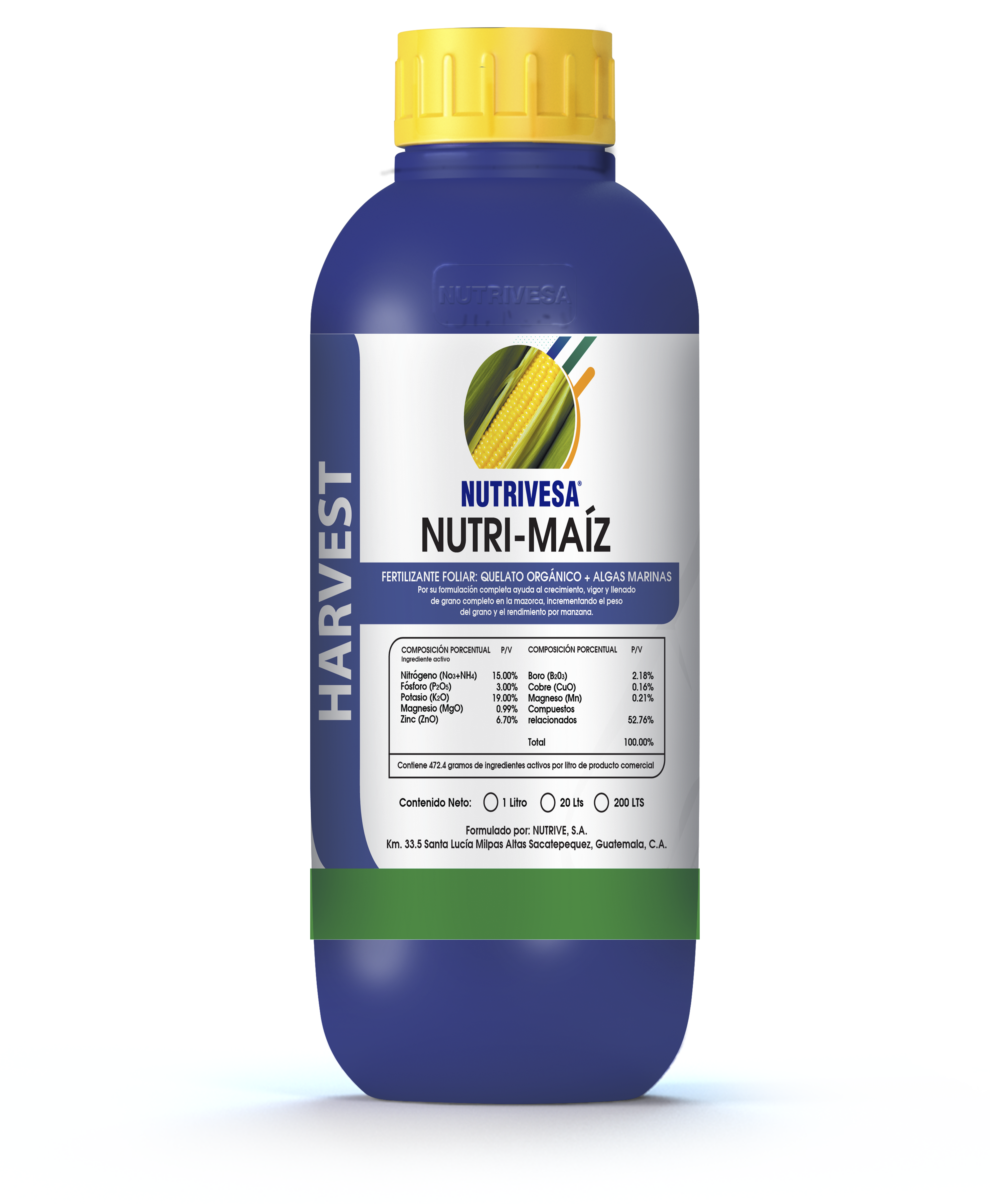 NUTRI-MAÍZ: por su formulación completa ayuda al crecimiento, vigor y llenado de grano completo en la mazorca, incrementando el peso del grano y el rendimiento por manzana.